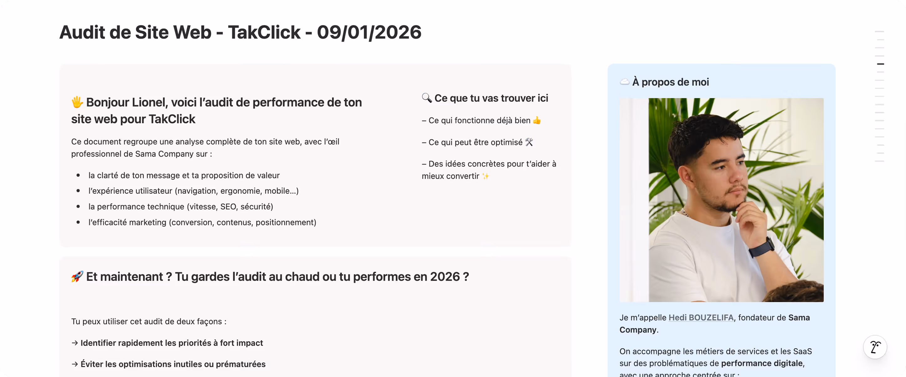 Pour toute entreprise qui a déjà un site mais qui doute de ses performances. PME, prestataires de services, SaaS. Si ton site existe mais ne génère pas de leads, c'est fait pour toi.