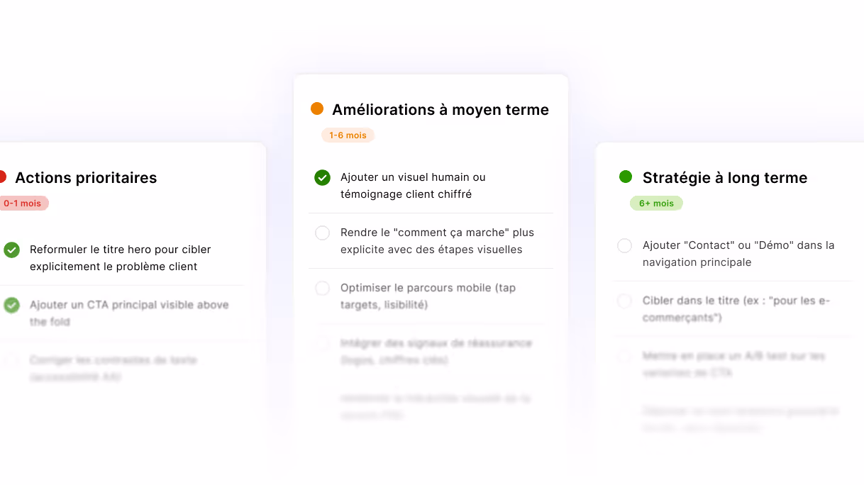 Proposition de valeur, message, parcours, CTAs, mobile, accessibilité. On évalue tout ce qui influence la décision de l'utilisateur, avec des observations et recommandations concrètes. Vous repartez avec un plan d’action concret, classé par impact et par priorité.